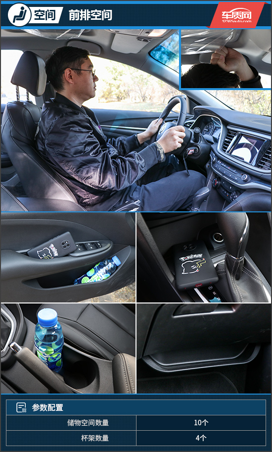 体验者身高为185cm,前排坐好后头部还有一拳余量,表现中规中矩。前排储物方面,门板储物槽开口很大,而且内部还进行了空间划分,实用性较强。车门拉手为封底设计,可以稳妥的放下一个手机。中控台底部有一个储物槽,不过容积较小,而且侧面的12V电源接口还侵占了部分空间。水杯架被放置在手刹右侧,采用贯通式设计,不过内部并未配备限位器。副驾驶前侧除手套箱外,底部还专门设计了一个放置雨伞的储物槽,实用性很强。