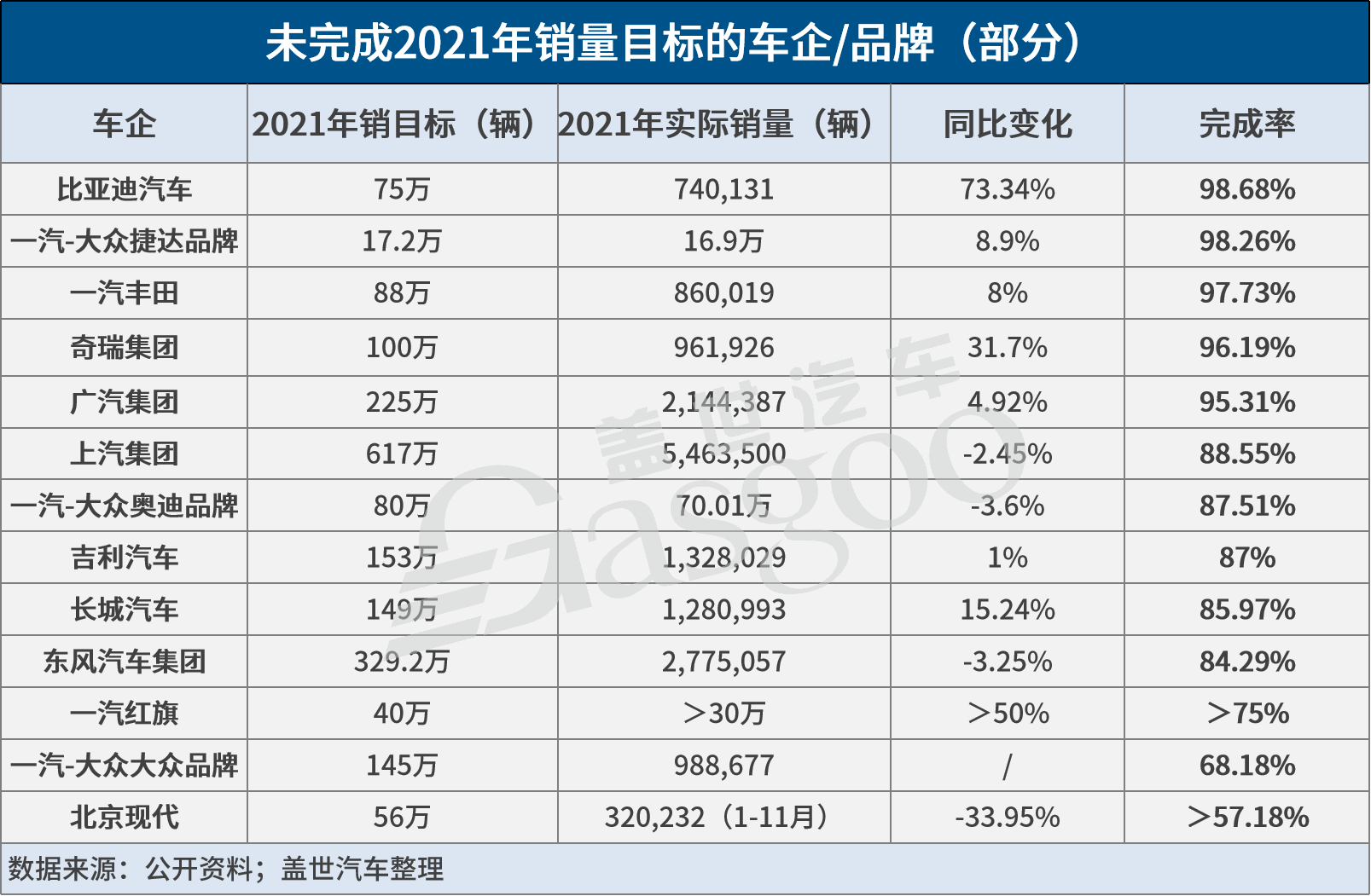 在此次统计的车企/品牌中,有13家未能完成2021年销目标。其中完成率在90%以上的有5家,分别是:比亚迪、一汽-大众捷达品牌、一汽丰田、奇瑞集团、广汽集团。