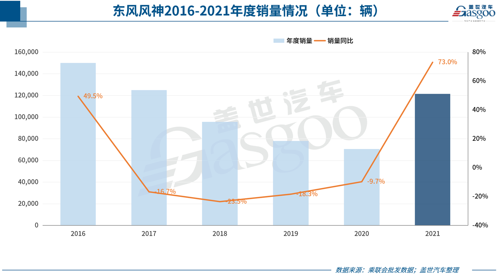 数据显示,在2016年达到15万辆的高点后,东风风神就进入了持续下滑通道中,2017年~2020年,东风风神的销量分别为12.5万辆、7.4万辆、7.5万辆和7万辆,整体呈下降态势。而2021年,东风风神总销量达到了121,570辆,同比增长73%。