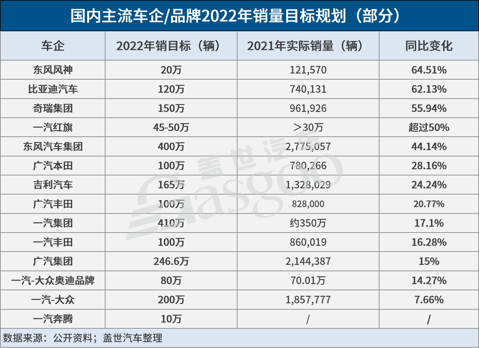 奇瑞、广汽等多车企未达成2021年销目标,但2022年仍欲集体大跨步