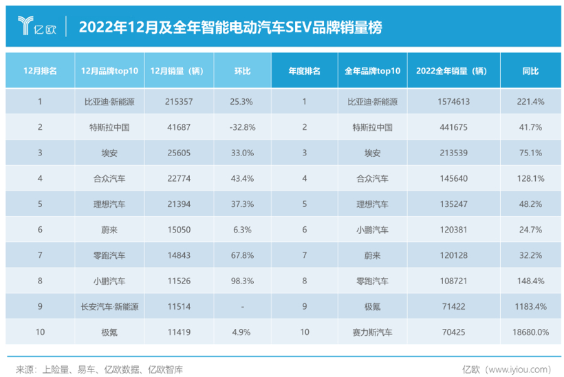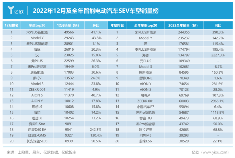 2022年12月及全年中国智能电动汽车SEV销量榜