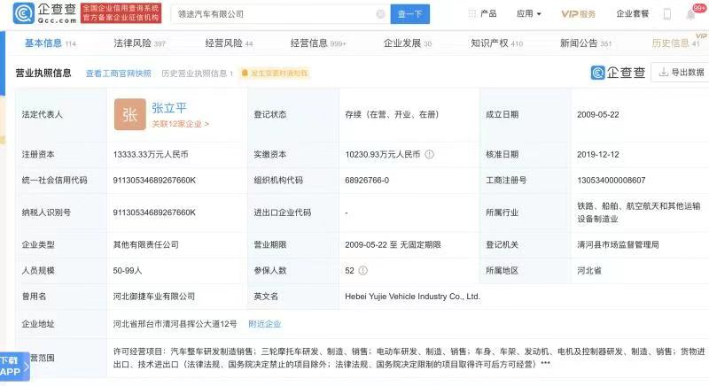 车讯宝典由企查查获悉,领途汽车有限公司成立于2009年,法定代表人为张立平,注册资本1.33亿元人民币。经营范围含汽车整车研发制造销售;三轮摩托车研发、制造、销售;电动车研发、制造、销售;车身、车架、发动机、电机及控制器研发、制造、销售等。企查查股权穿透显示,该公司大股东为张立平,持股59%;深圳长城汽车销售有限公司为第二大股东,持股比例25%。