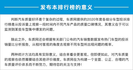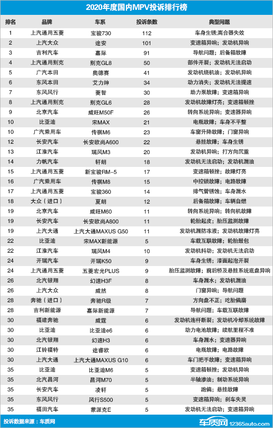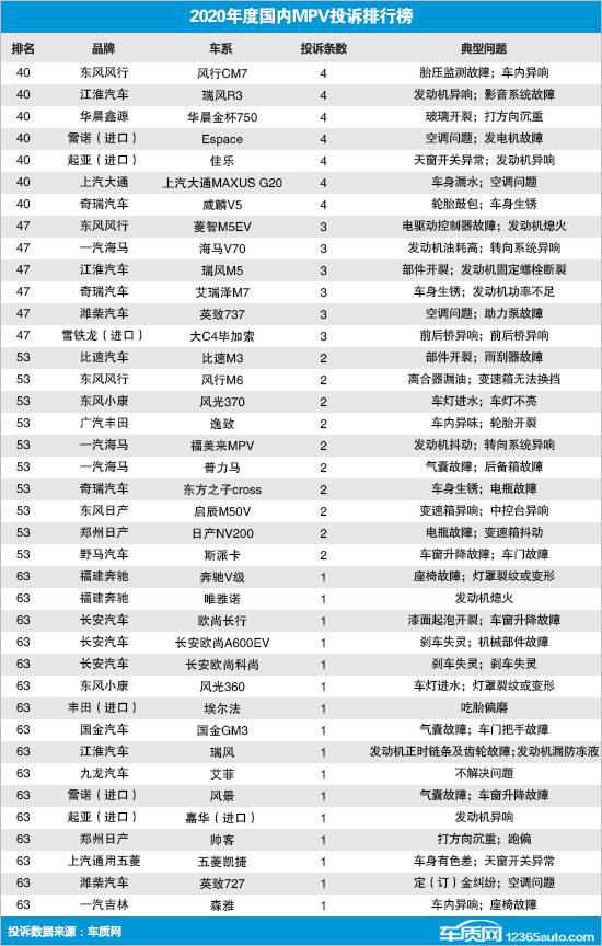 2020年度国内MPV车型投诉排行榜