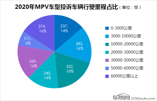 在2020年MPV车型投诉车辆行驶里程数统计中,行驶里程在10000-20000公里车型占比相对较高,但投诉量相比2019年基本持平。此外,行驶里程在30000-50000公里以上的车型占比较2019年也有了大幅降低。从MPV车型出现问题时间段和车辆行驶里程统计中可以发现,国内MPV车型的投诉主体由此前的老款车型正逐渐向新款车型转变。