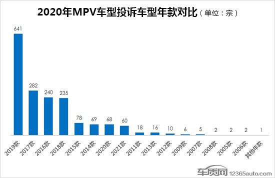 据车质网数据显示,在2020年国内MPV车型投诉中,2019款车型的投诉量远高于其他各年款车型,而2019年投诉排行前两位的2017和2016款车型投诉量出现明显下降。值得注意的是,随着新车型陆续上市,2021款车型也开始出现投诉,但投诉量仍处于较低水平。从上表我们可以看出,目前国内MPV车型的投诉仍多集中在上市3年内的老款车型。
